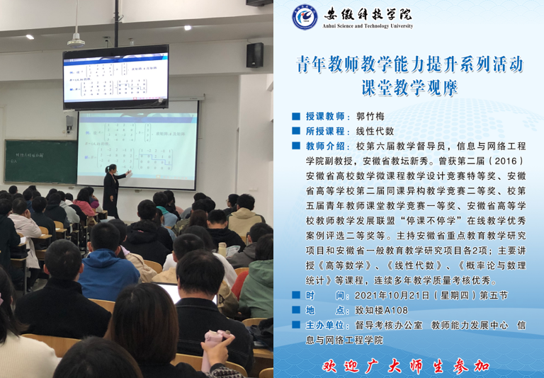 为深入推进党史学习教育,深化“我为群众办实事”实践活动,更好发挥教工党员的先锋模范作用,学院党委委员、安徽省教坛新秀郭竹梅10月21日下午为近年来的新进教师在致知楼A108开展了教学观摩活动。