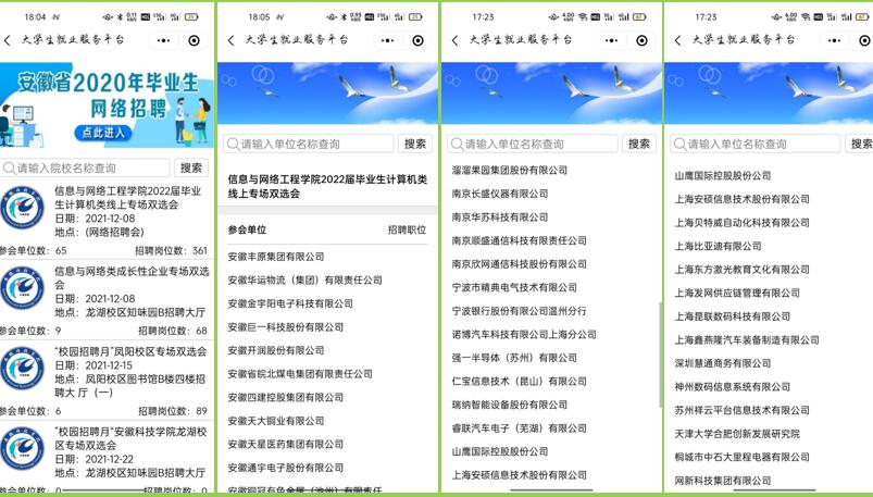 为贯彻落实习近平总书记在党史学习教育动员大会上的重要讲话精神,切实做好毕业生和用人单位的有效对接,积极推进毕业生就业工作,12月8日-12月9日,信息与网络工程学院通过安徽省大学生就业服务平台举办计算机类线上专场双选会,学院2022届毕业生和用人单位使用“安徽省大学生就业服务平台”微信小程序参加双选会。