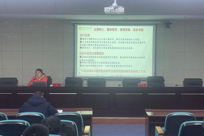 南京大学马克思主义学院党委副书记时昱教授以《研究生价值引领与高质量培养》为题,就研究生工作的发展与推进、研究生阶段容易出现的主要问题、研究生价值引领与高质量培养及构建新型师生关系的典型案例等方面进行分享。报告指出建立良好的“导学关系”是提高研究生教育质量的重要保证,对研究生的成长与发展发挥决定性作用。时昱教授系统阐述了研究生高质量培养的体系建设,分享交流了新型师生关系的构建,这为我校研究生教育发展指明了方向。