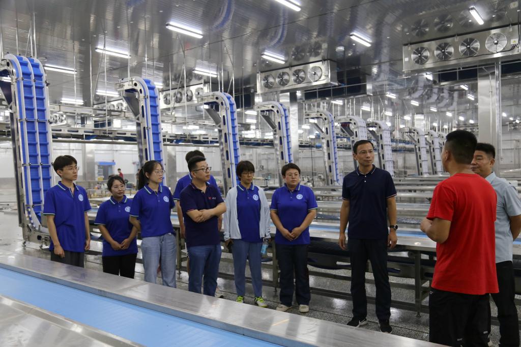 易县桥头乡匡山村的建设工地上,河北太行禾丰牧业有限公司巨大的现代化鸡肉深加工厂即将完工投产。师生参观了肉鸡屠宰加工生产线,了解了产品加工的工艺流程和现代化冷链运送技术,对自动化屠宰线与传统加工工艺如何更好结合,确保产品质量安全的前提下最大程度的保留鸡肉原有的风味进行了交流。