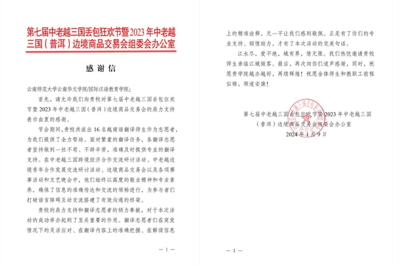 12月21日至26日,云南华文学院16名越南语专业师生前往普洱市江城县参加第七届中老越三国丢包狂欢节暨2023年中老越三国(普洱)边境商品交易会,参与了中老越三国跨境经济合作研讨、民族美食文化等五大类22项活动的越南语翻译志愿服务工作。