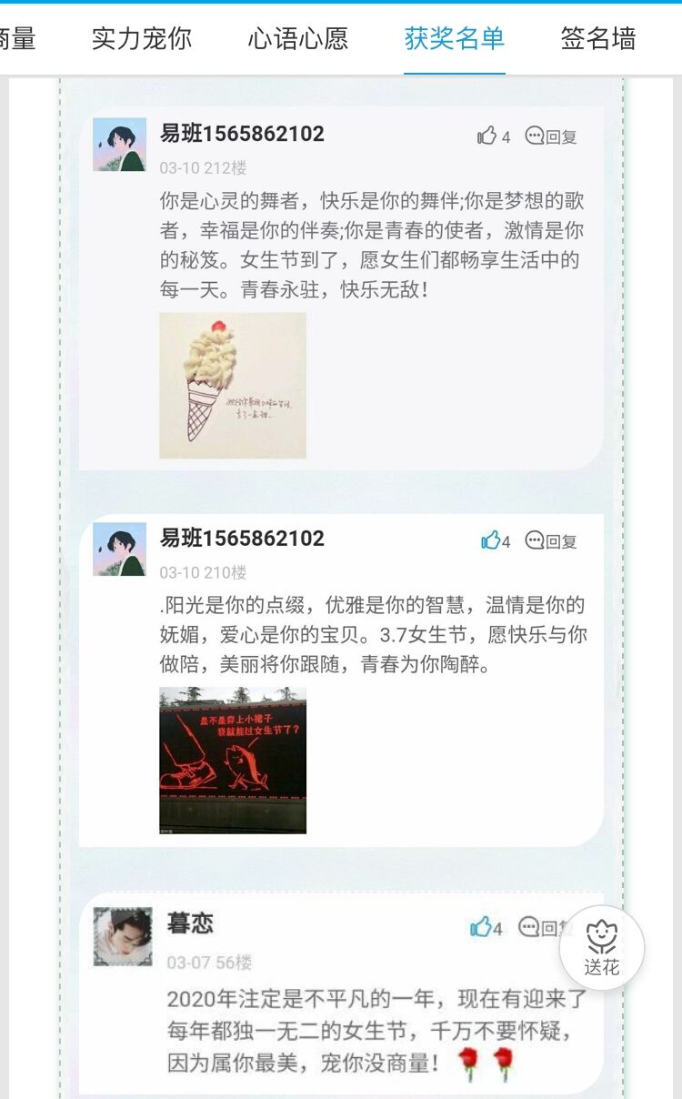 活动共分为两个板块“心语心愿”和“实力宠你”。“心语心愿”板块主要为参与者在留言区留下祝福,即可获取刮奖机会,后期将根据点赞量多少作为评选标准征集文案,选取前十名的文案以推文的形式进行展示;“实力宠你”以个人或班级为单位制作有关祝福女生的作品,作品以摄影照片、手绘涂鸦、手抄报以及短视频为主要参赛形式,最终通过投票以及评委打分的方式进行相应奖励。