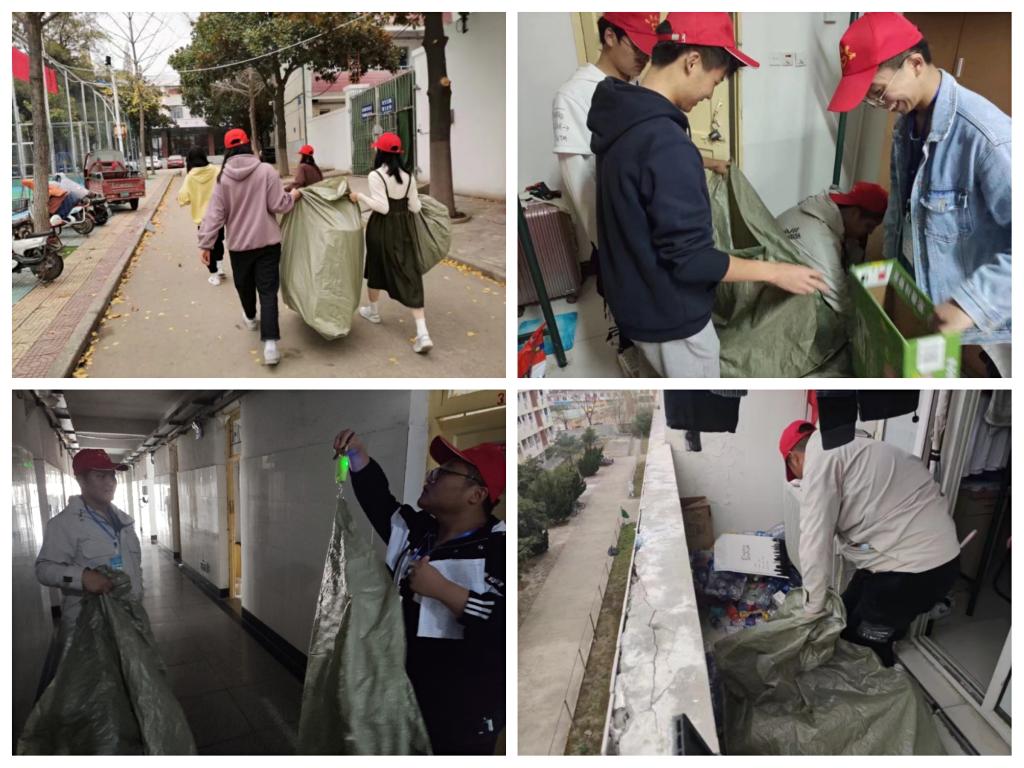 活动前期,工作人员准备好工作所需的用具,并联系好资源回收站,分别在男女生宿舍楼各楼层设置小组组长。随后,由各组长带领组员们到宿舍楼进行公益品回收。在回收过程中,大家一遍又一遍地耐心询问、分类,同学们积极配合,活动开展得非常顺利,他们纷纷拿出自己的废瓶纸箱、旧衣旧物,既进行了寝室卫生大扫除,又用实际行动践行了环保理念,并将爱心传递给他人。资源回收过程又脏又累,但各组成员们丝毫没有抱怨,分工有序,团结合作,一趟又一趟把满满当当的回收袋运至固定点,并将其进行分类整理,便于回收利用,可谓是最可爱的“公益搬运工”。