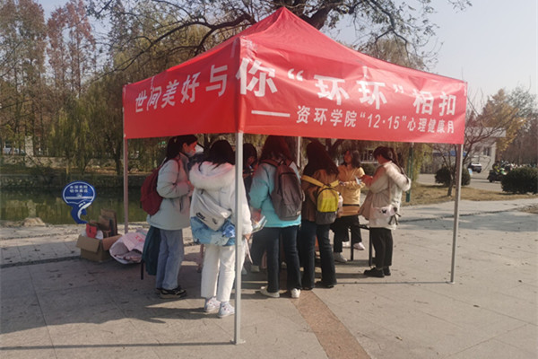 根据学校第一届“12·15”大学生心理健康月活动通知要求,资源与环境学院结合专业特色,以“环保”为主题,聚焦学生寝室关系,特开展“世间美好与你‘环环’相扣”特别主题活动,12月5日下午,活动在西区小广场和东区食堂前开展,学院非毕业班学生以宿舍为单位参加。