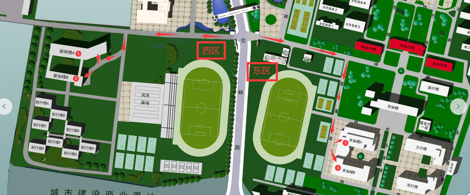 凤阳校区考场安排在西区的新知楼A座、B座和东区的求知楼A座、B座,分别标注①②③④图标。请考生根据图中箭头方向前往考场。